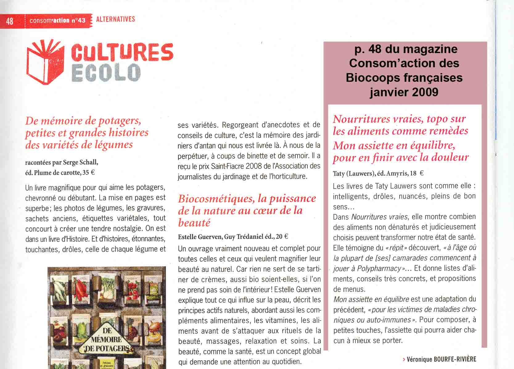 Nourritures vraies, par Véronique Bourfe-Rivière, dans le magazine Consom'action des Biocoops françaises, janvier 2009